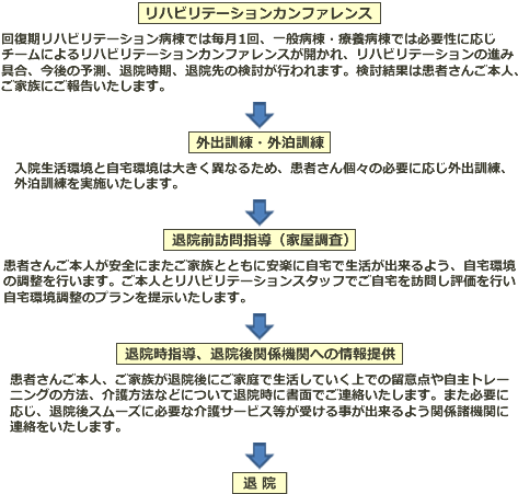 入院早期よりリハビリテーションスタッフがチームで関わり、定期的にご家族にリハビリテーションの進行状況を御報告いたします。また退院にむけて外出や外泊の練習、家屋状況の評価なども行い、スムーズに在宅生活に結び付けられるようリハビリテーションを実施していきます。