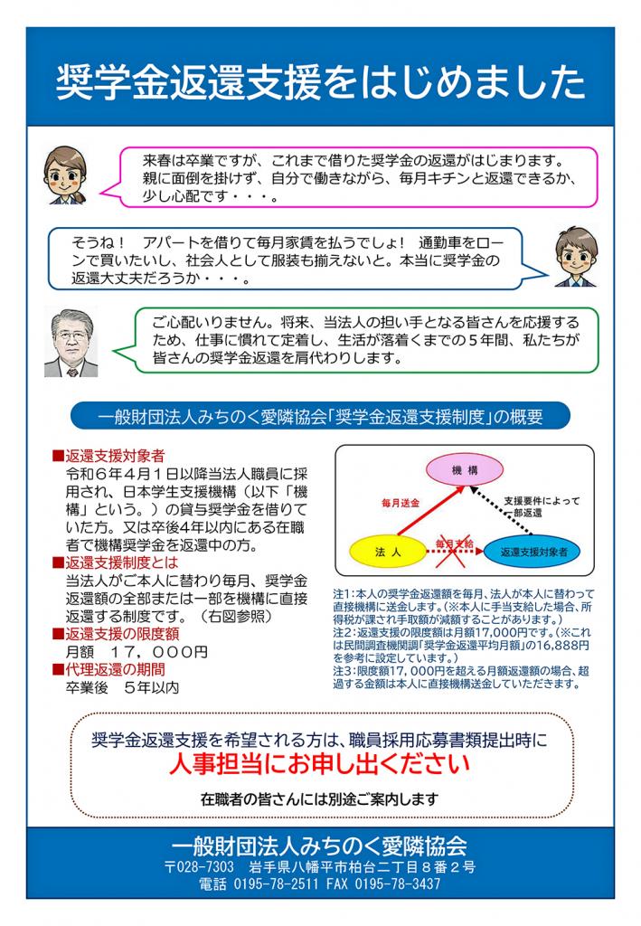 | 当法人では、2024(令和6)年4月1日採用職員と現に当法人で働いている職員(4年以内の在職者)を対象に、日本学生支援機構の貸与奨学金(第一種及び第二種)の返還を最長5年間、法人が代理返還(肩代わり)する「奨学金返還支援(代理返還)制度」を創設しました。